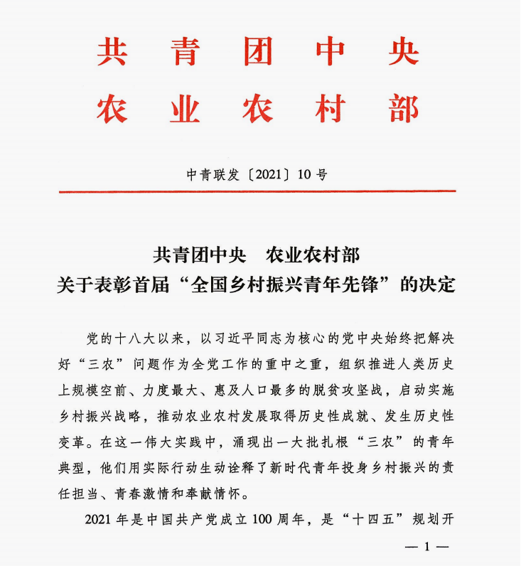 日前,共青团中央、农业农村部下发《关于表彰首届“全国乡村振兴青年先锋”的决定》(中青联发〔2021〕10号)。经团市委推荐,我院薯类研究所助理研究员余韩开宗荣获首届“全国乡村振兴青年先锋”称号。